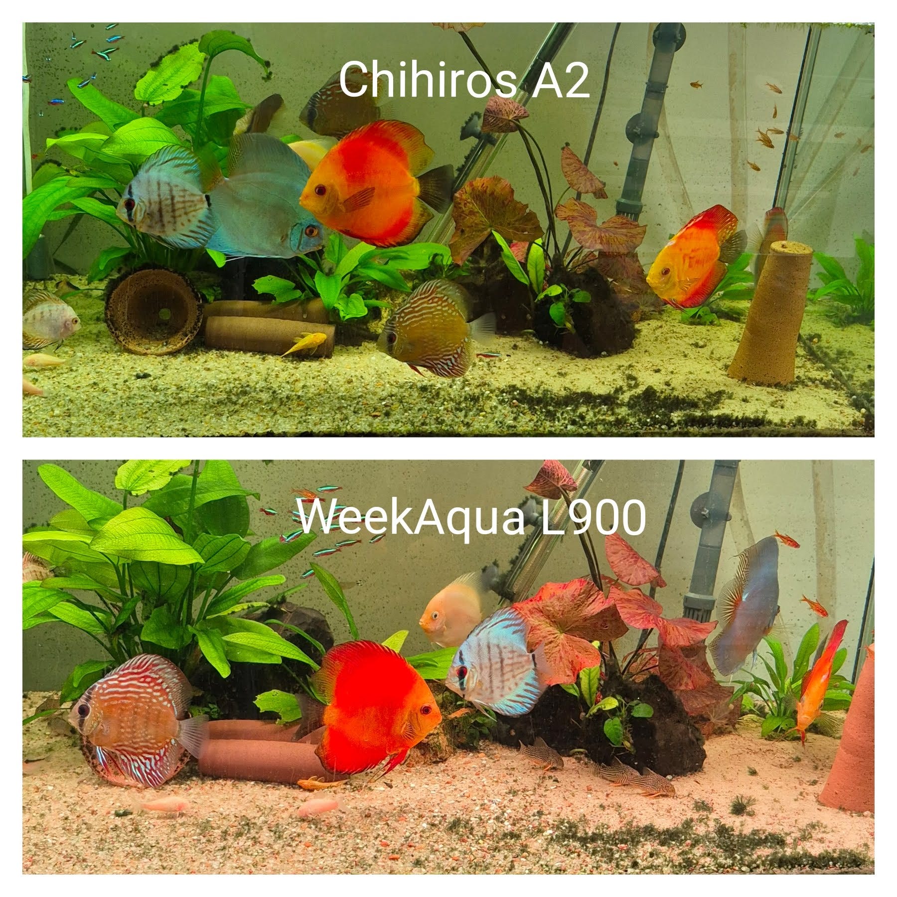 Corta pra 2023: em algum momento naquele ano, eu desencanei da questão plantas no meu aquário principal e assumi que o foco era ser um aquário de acarás disco. Continuo com plantas, mas de baixa demanda e preferencialmente fixas na decoração (epífitas). Ato contínuo, resolvo vender a Chihiros RGB (modelo A601 plus) que eu tinha (um quebra-galho, já que ele era de um aquário menor que eu doei, e já não dava muito conta do atual) e coloquei uma dessas mais em conta compradas no mercadolivre. Em pouco mais de 1 ano ela parou de funcionar, aí fui pra uma Chihiros mais básica, com LEDs brancos. Para os peixes, estava tudo bem. Mesmo sem focar plantas, a iluminação influencia o comportamento dos peixes, ajuda na regulação de seus ciclos biológicos e proporciona um ambiente mais próximo da natureza. Só que eu vinha tendo embates com algas petecas, e já venho há algum tempo baseando meu combate às algas em fazer o possível para que as plantas (ainda que poucas e de crescimento lento) ganhem a disputa por nutrientes. As plantas mais próximas ao substrato tinham clara dificuldade de se desenvolver. Levantei a hipótese da minha luminária não estar entregando PAR suficiente para elas e pimba! É uma boa luminária de entrada, mas não para um aquário com 50cm de altura. Junto a isso, uma questão estética: a antiga RGB de 60cm que estava de quebra-galho realçava muito mais a cor dos peixes, mesmo criando áreas de sombra por não ser comprida o suficiente. Eu costumo tomar “decisões de investimento” para o meu aquário em questões mais técnicas, focando o bom funcionamento do aquário, mas aqui eu me rendi a estética. Meu aquário é um elemento decorativo da minha casa, fica na minha sala, e os discos com cores brilhantes dão aquele efeito “uau” no ambiente, especialmente no início da noite (eu desligo as luzes entre 19h e 20h). Pronto, lá fui eu trocar de luminária.