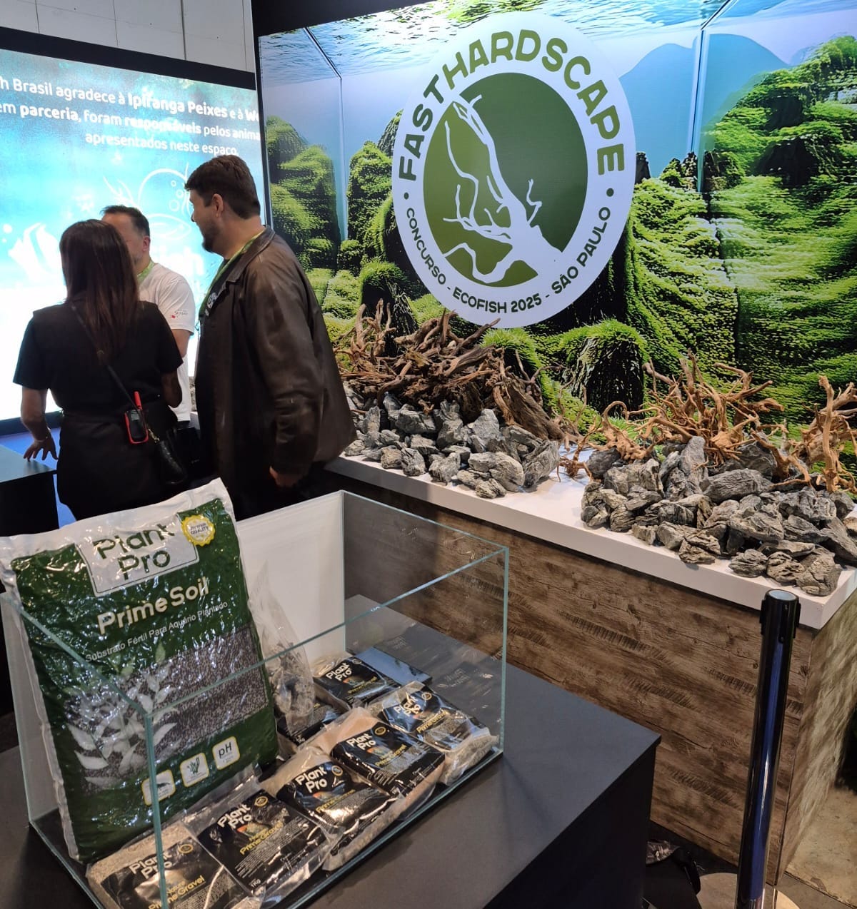 Na parte de aquarismo — a que mais me interessa — pude conversar com profissionais e distribuidores sobre praticamente tudo relacionado ao hobby: rações de diversas marcas, aquários de vidro, luminárias, filtros e, claro, acessórios para aquapaisagismo, minha especialidade favorita. Dentro desse tema, além do belíssimo paludário feito pelo Carlos Souza (Fazenda Submersa) e poder ver de perto o aquário montado pelo Luca Galarraga (atual campeão mundial do IAPLC) para o evento Rio Aqua do ano passado — e trazido para o evento pela distribuidora Drop Aquarismo — o ponto alto para mim foi o concurso de Fast Hardscape.