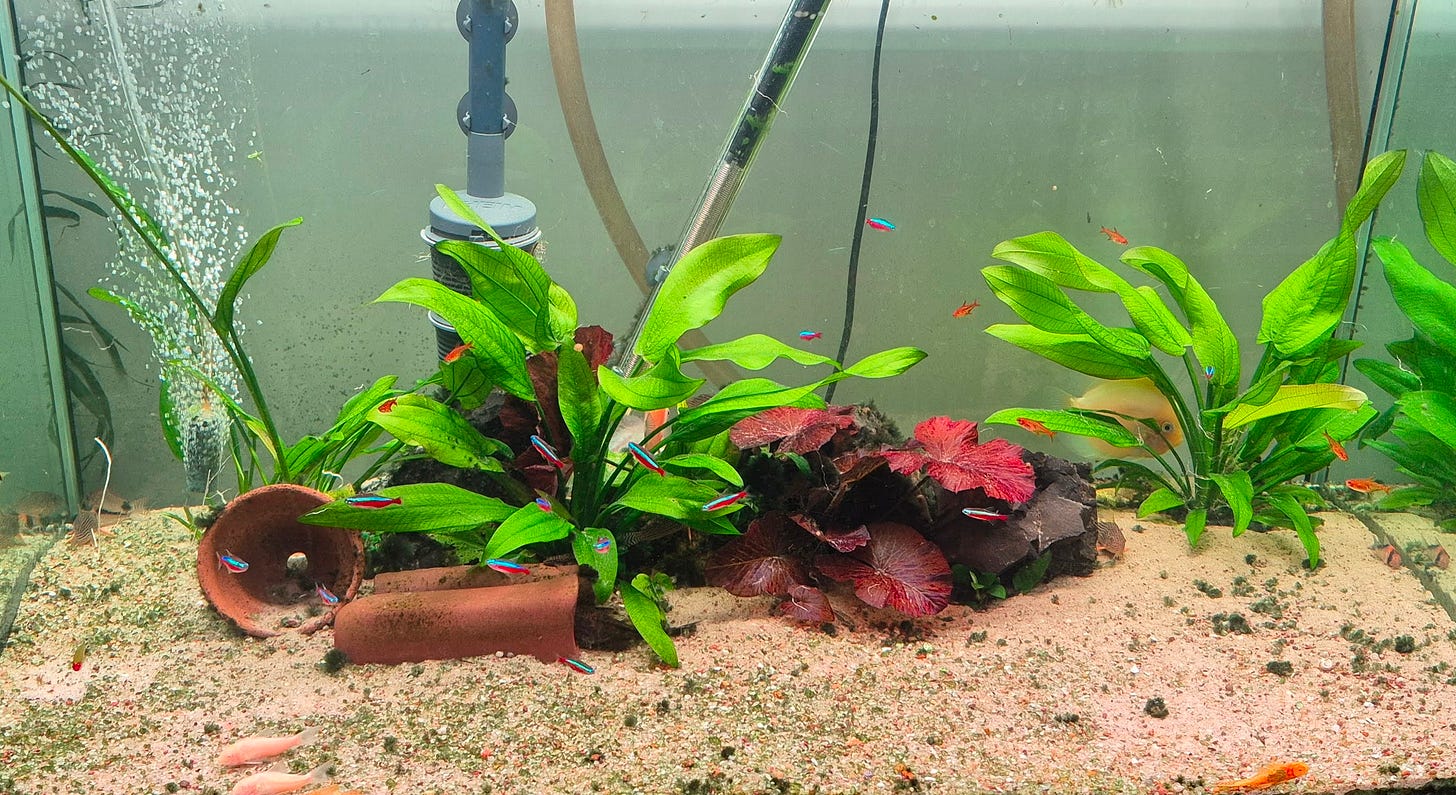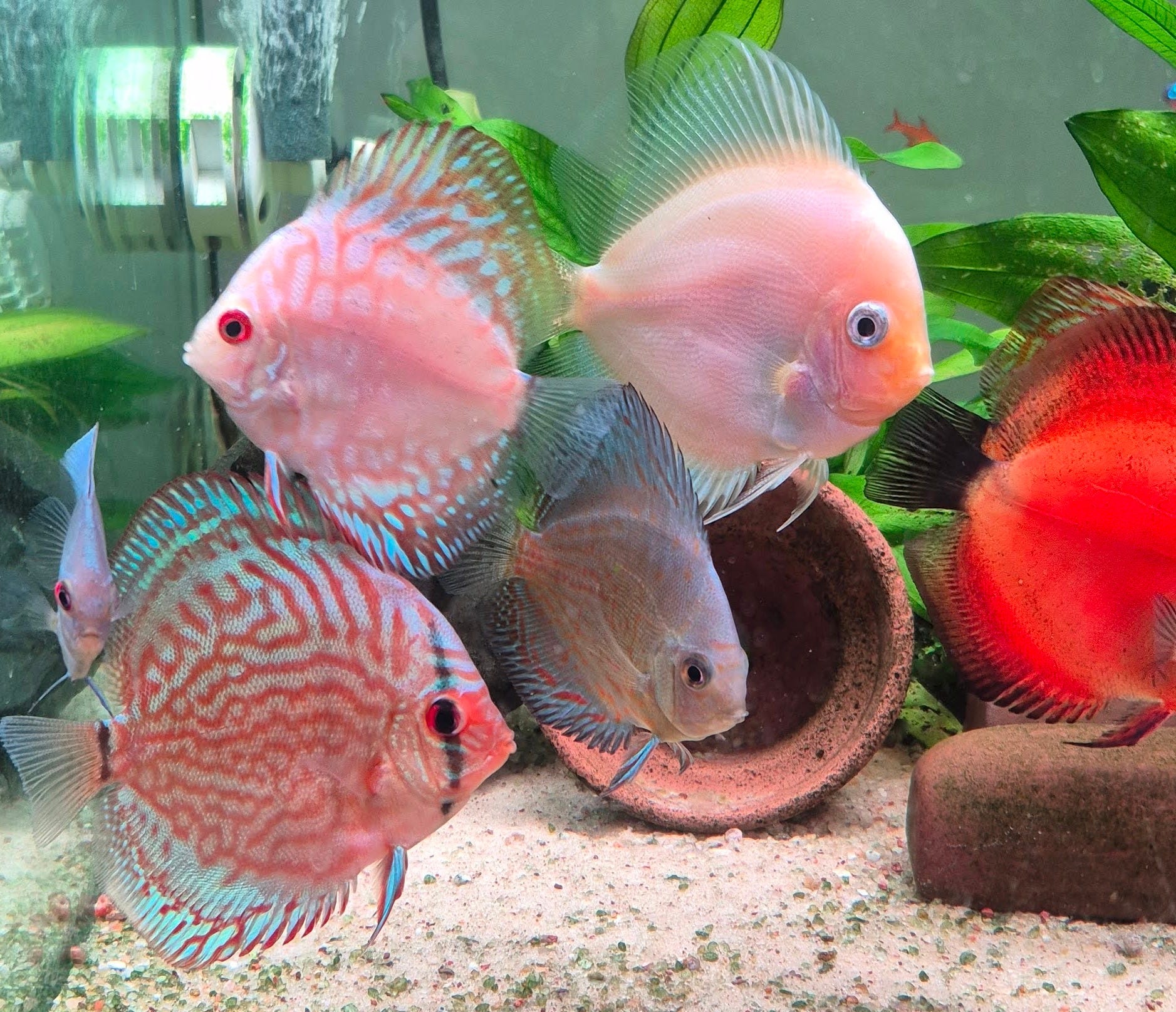 Passadas duas semanas, consegui mais 3 exemplares de padrão bem bonito com o Antônio (um stardust, Maraísa, um red royal, Caramelo, ambos com cerca de 9cm, e um blue diamond, Afonso, de aproximadamente 7cm). Com isso tinha chegado no meu número mágico de cardume de discos: 6. No entanto, todos seguiam reclusos, se escondendo. Mesma coisa de antes: assustadiços, só passeando a noite e comendo os restos de comida ao fundo quando não tinha ninguém perto do aquário. Para nós, um tremendo anti-climax: o grande barato de manter acarás disco ao longo desses anos era esse comportamento de bicho de estimação (pet) que eles adquirem. Puxei na memória pra ver se eu estava esquecendo de fazer alguma coisa e me toquei que, desde 2019 (a Manuela, um blue turquesa já adulto que durou pouco mais de 3 anos com a gente), praticamente toda vez que eu inseria um novo peixe, tinha um grandinho e/ou dominante que no final das contas doutrinava os novatos. Agora os veteranos eram 2 peixes que não pegaram a tempo o comportamento dos demais (Zeca e Zezinho).