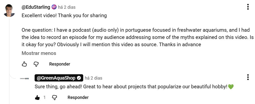 Mas voltando a questão das pautas. Enquanto eu me preparava para detalhar as pautas, recebo aviso de um novo vídeo do canal Green Aqua (por enquanto restrito aos membros do canal, o que eu aliás recomendo - é barato e sempre tem conteúdo bom), falando de 21 mitos do aquapaisagismo. Às vezes é preciso ser um pouco menos cartesiano e deixar esses insights tomarem conta, e com isso teremos a parte 2 do episódio “Mitos e verdades do aquarismo”. Por via das dúvidas, mandei uma mensagem pro pessoal lá na Hungria. Sempre solícitos, responderam prontamente dando sinal verde.